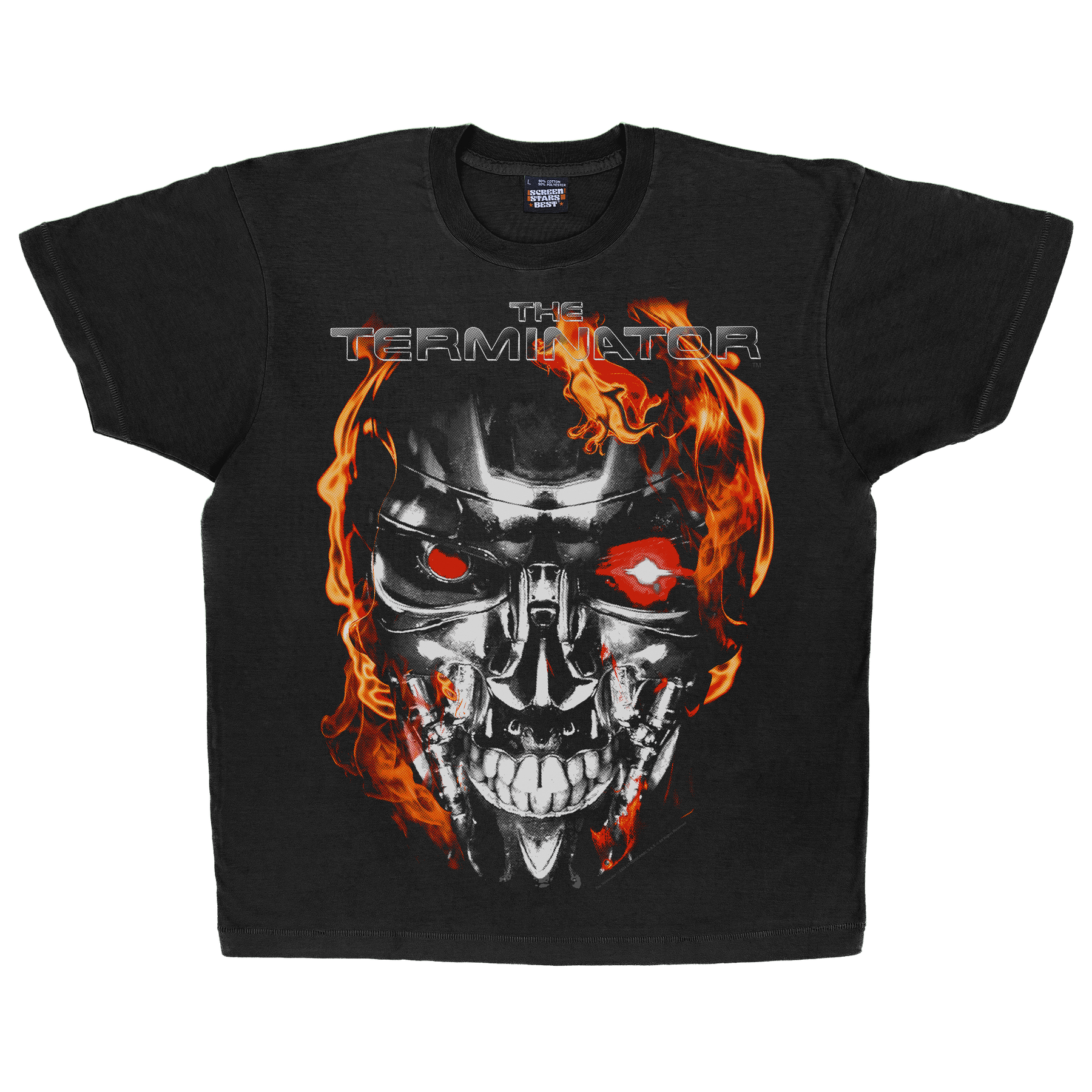 Black t-shirt with 'The Terminator' graphic design featuring a robot skull with flames.